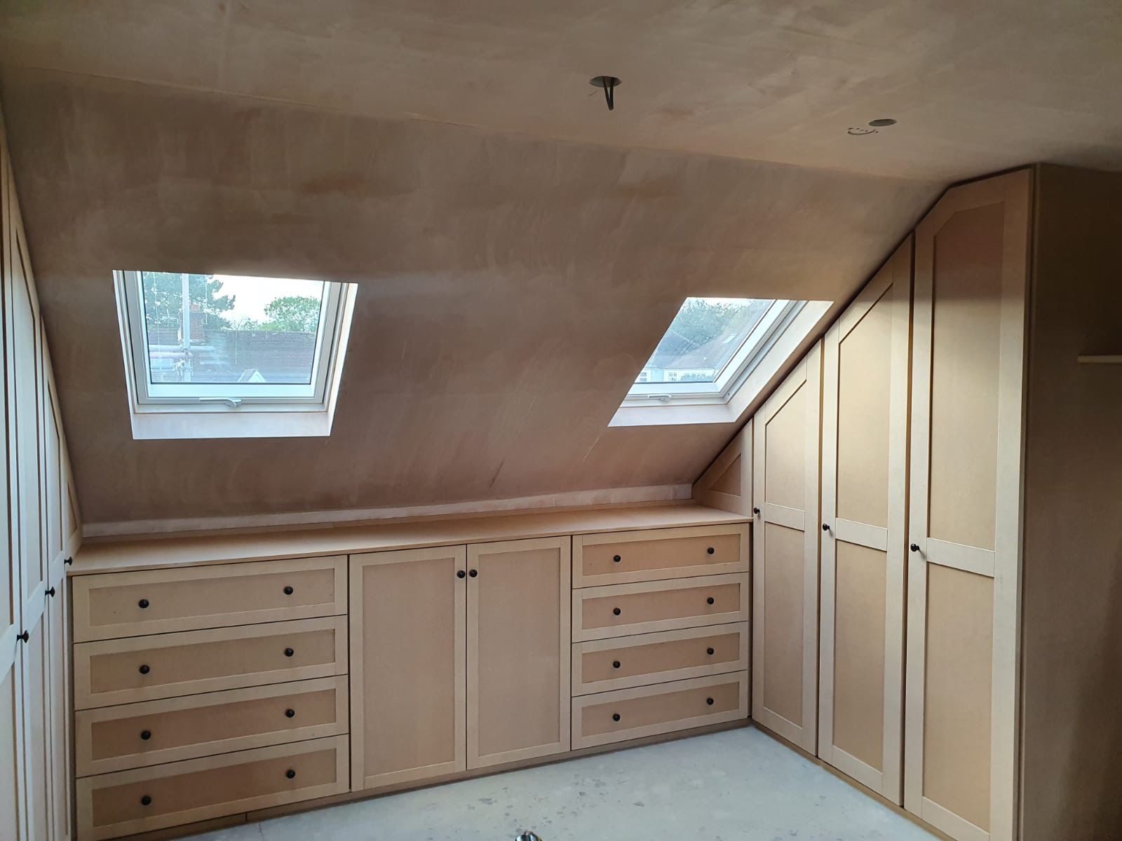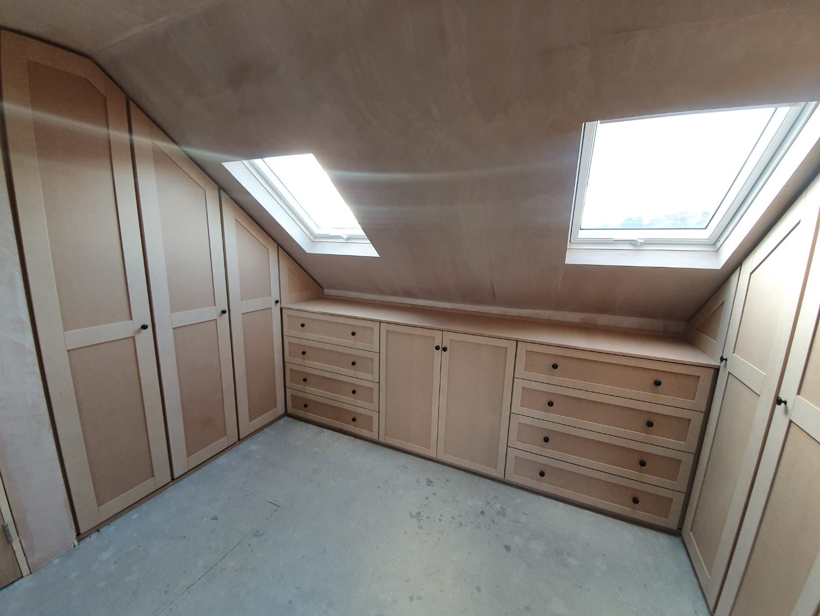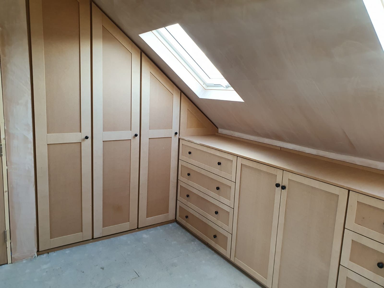 In Bromley, KB Renovations designed and fitted bespoke wardrobes to a new loft conversion. Hand built using MDF wood and soft closing door hinges the wardrobes were built to utilise all of the available space in the new room.