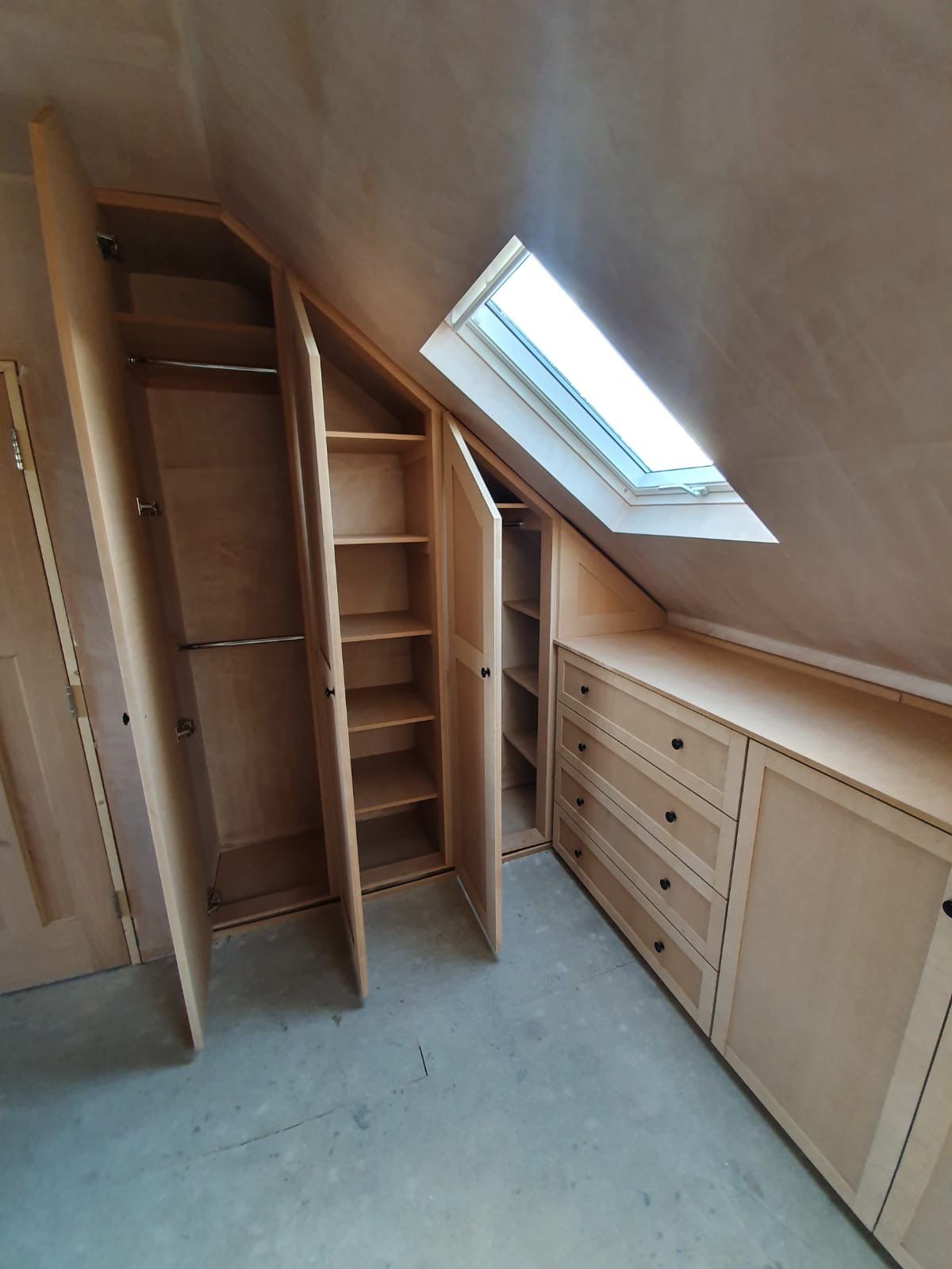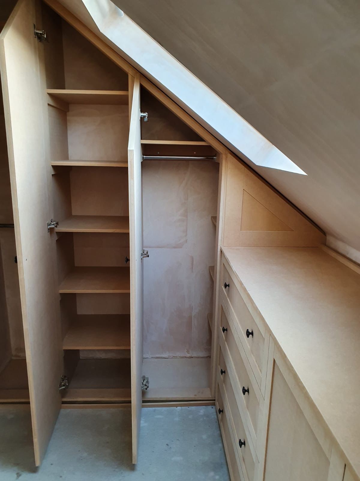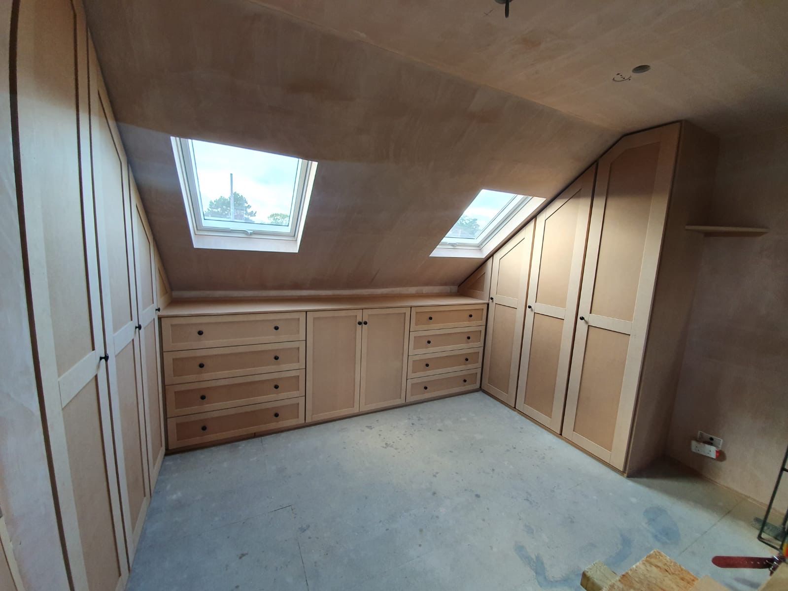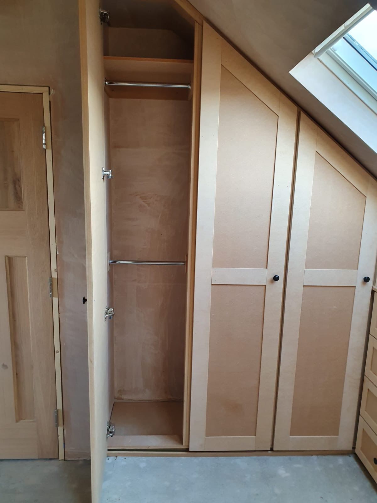 In Bromley, KB Renovations designed and fitted bespoke wardrobes to a new loft conversion. Hand built using MDF wood and soft closing door hinges the wardrobes were built to utilise all of the available space in the new room.