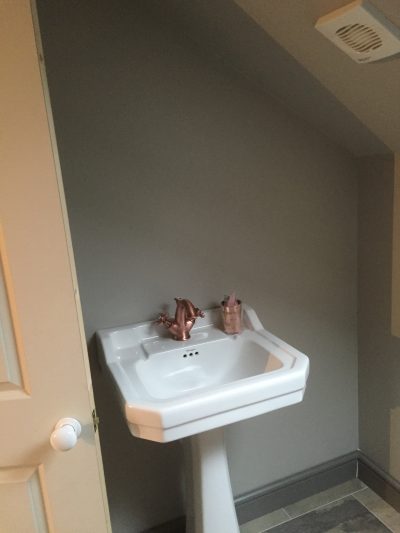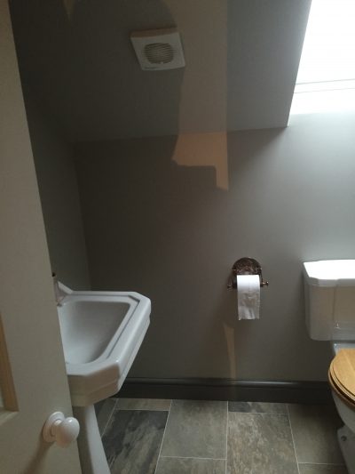 We tiled the floor, walls around bath and the side of the bath. Next, we fitted skirting boards. We fitted a towel rail and an extractor fan, sink and toilet and then painted the room.