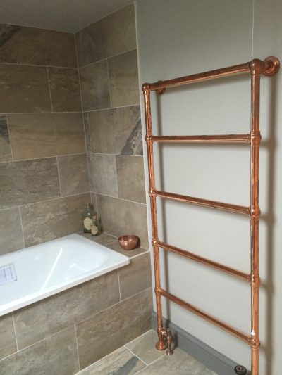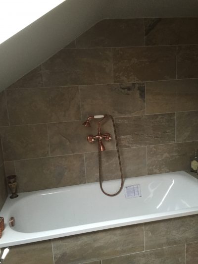 This bathroom was fitted by KB Renovations in the customers newly renovated loft conversion in Catford SE6. The customer choose the bathroom tiles and a bath built in with shower unit above, small sink and a toilet as well as a towel rail.